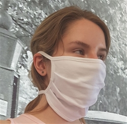 Mund-Nasen-Maske weiß, 2-lagig 100 % Baumwolle, 150g/m², waschbar bis 95 ° / rechts/links mit jeweils zwei Bändern zum Schnüren. Es handelt sich weder um ein Medizinprodukt noch um eine persönliche Schutzausrüstung (PSA). Umtausch oder Rückgabe ausgeschlossen.